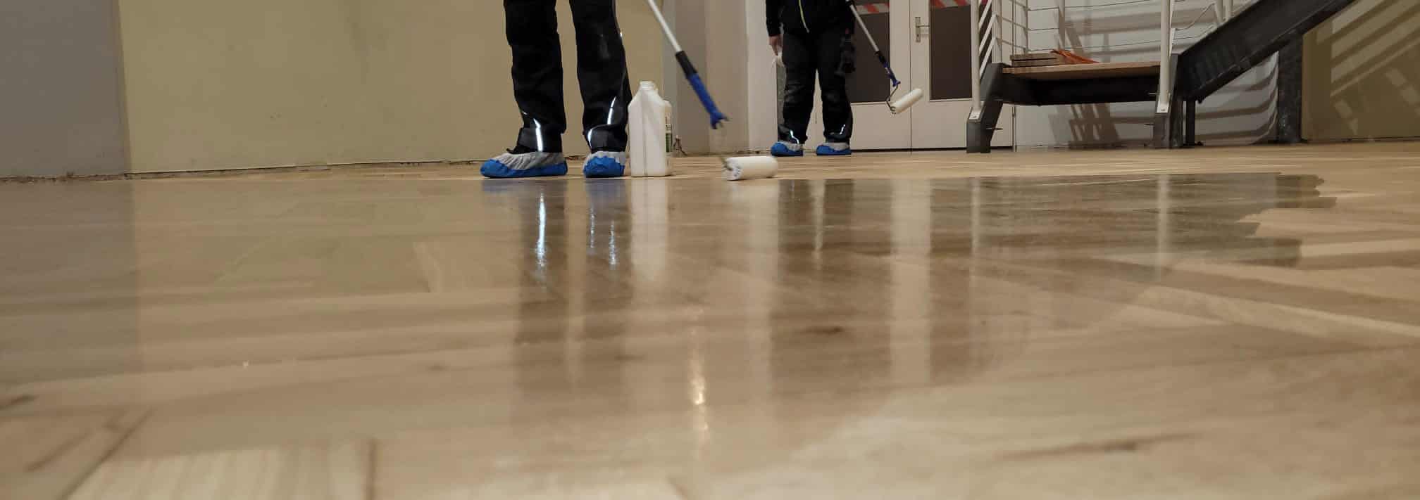 In diesem Falle haben wir den Lack TrafficHD von Bona aufgebracht. Der ist hochbelastbar, vergilbungsfrei und gegen die meisten Chemikalien beständig. Er hat zudem eine hohe Rutschsicherheit und besitzt eine EC1 Plus – Zertifizierung. Die Emissionen dieses Baustoffes liegen also im kaum messbaren Bereich.